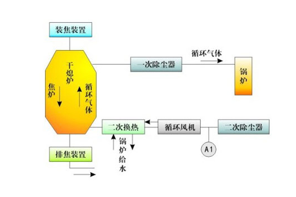 熄焦有濕法熄焦和干法熄焦兩種方式。前者是用熄焦車將出爐的紅焦載往熄焦塔用水噴淋。后者是用1 80°C左右的惰性氣體逆流穿過(guò)紅焦層進(jìn)行熱交換,焦炭被冷卻到約200°C,惰性氣體則升溫800°C左右,并送入余熱鍋爐,生產(chǎn)蒸汽。每噸焦發(fā)生蒸汽量約400 ~ 500公斤,干法熄焦可消除濕法熄焦對(duì)環(huán)境的污染,提高焦炭質(zhì)量,同時(shí)回收大量熱能,但基建投資大,設(shè)備復(fù)雜,維修費(fèi)用高。針對(duì)目前國(guó)內(nèi)普遍使用的干熄焦方式,我們?yōu)榭蛻籼峁㈱N-CDQ系統(tǒng),保證安全同時(shí)有效提高氣體回收率,為客戶創(chuàng)造更大的效益。